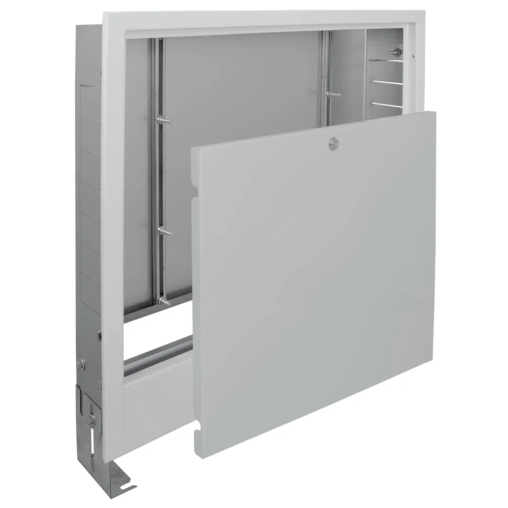 Falba építhető fém osztószekrény víz-gáz szereléshez levehető fedéllel, állítható mélységgel és magassággal.