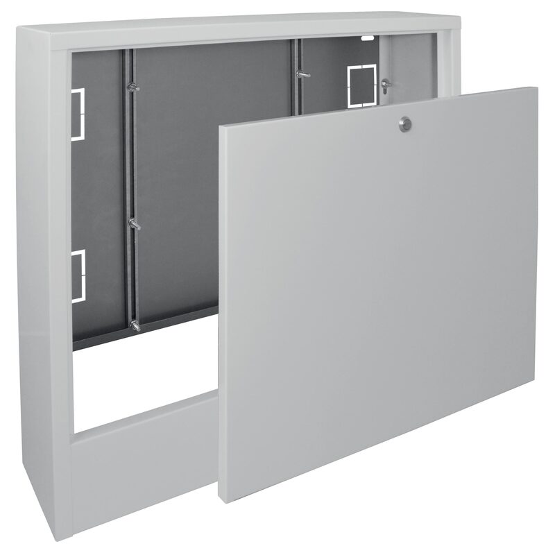 Falon kívüli osztószekrény víz-gáz szereléshez. 0,8 mm-es lemezből készül, fedele teljesen levehető.