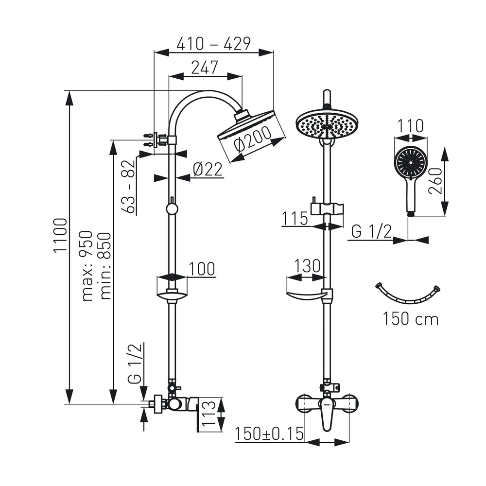 - Fém zuhanyrúd: 110 cm hosszúságú, falról állítható távolsággal.