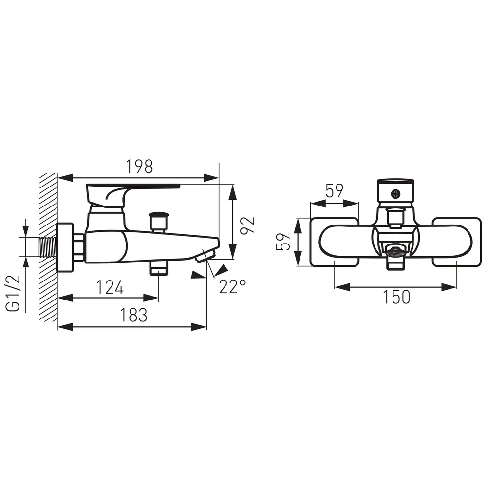 Fali kádcsaptelep automata zuhanyváltóval, M24x1 perlátorral, Z-idom G1/2, kiállások közötti távolság 150 ± 20 mm, zuhanyszett nélkül.