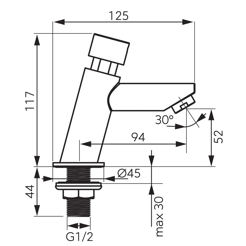 Innovatív önelzáró nyomógombos álló csaptelep 10-20 mp állítható vízfolyási idővel.
