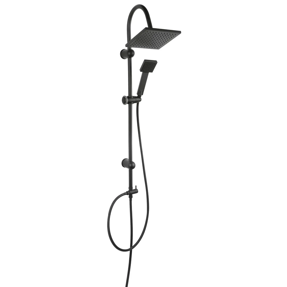 Modern, fekete szögletes zuhanyszett, állítható rögzítőkkel, 20 x 20 cm-es fejzuhannyal és 1 funkciós kézizuhannyal.