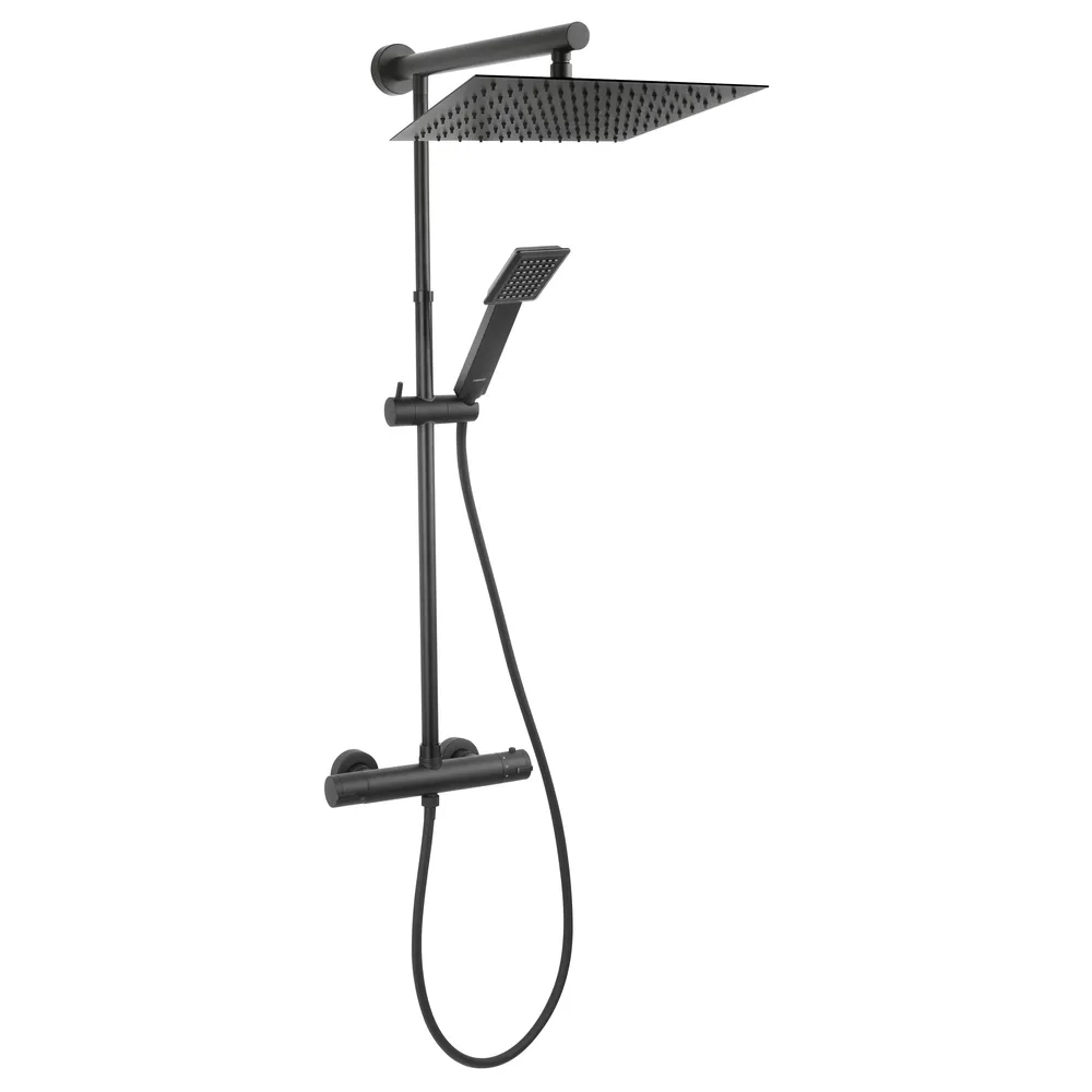 Trevi Square Black – zuhanyrendszer esőztető fejzuhannyal és termosztátos csapteleppel.