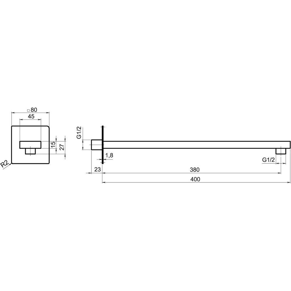 Falra szerelhető, szögletes zuhanykar króm felülettel, 400 mm hosszan, 1/2” csatlakozással.